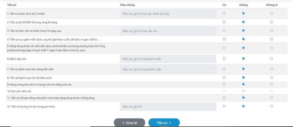 Hệ thống đã liệt kê các thông tin về tiền sử bệnh và cho người đăng ký tiêm chủng lựa chọn theo tiêu chí: